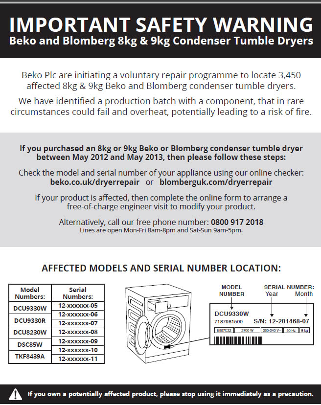 beko.co.uk/dryerrepair or blomberguk.com/dryerrepair